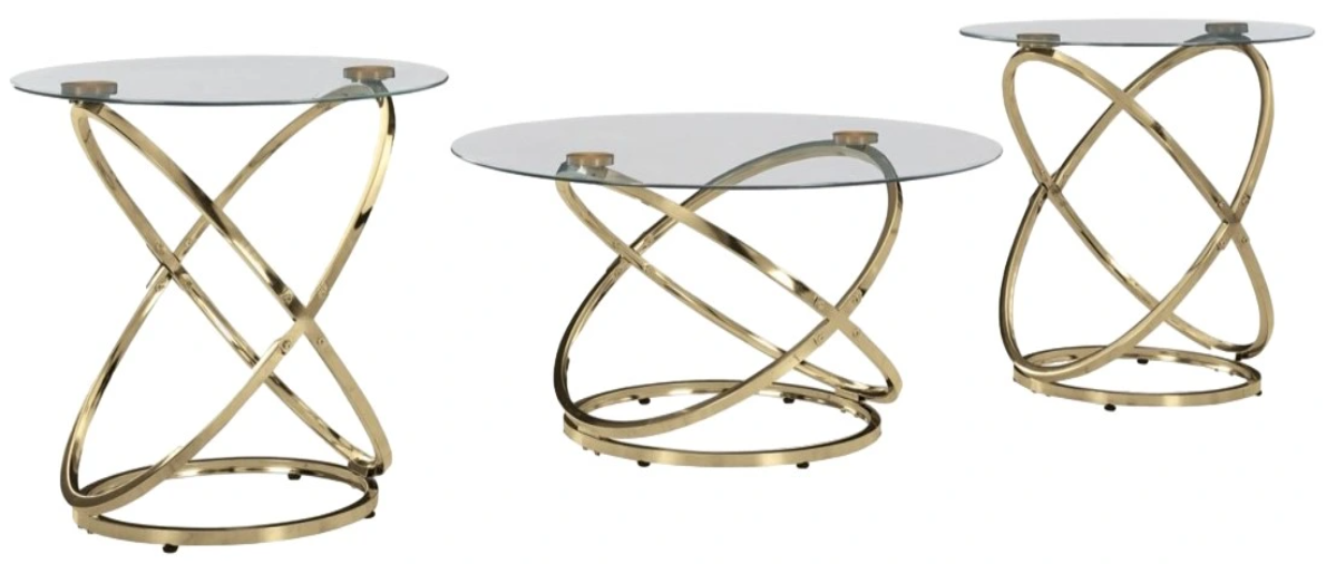 Fall in love with the contemporary design of this accent table set. Crafted with tubular metal in a captivating champagne goldtone, each features a sleek drum design. The clear tempered glass tabletop offers both style and durability. Create a stunning focal point in your home with these one-of-a-kind tables.Read More